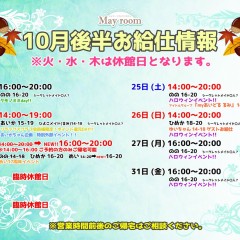 本日はオープン前から🈵ご帰宅ありがとうございました💖 10/20(月)〜24(金)休館日🌱 25(土)は14時から20時まで🕰️ハロウィン衣装𝐃𝐚𝐲🎃一日目🍬ひよこメイド🐣るみ14-18♡のの16-20♡secret maid○人? 全てのお時間スムーズにご案内可能💫 ご予約はDM[@mayroom_room]へお問い合わせ下さい💌 https://t.co/eg0wFYxHPB