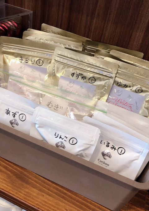 お屋敷ではカウンターの後ろの棚にみんなの名前が入った袋が並び始めました!