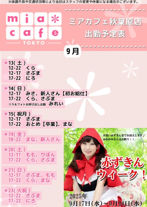赤ずきんウィークinミアカフェ秋葉原店 2025年9月17日(水)~24日(水) 9月19日(金)  18-22 まな・初回勤務の新人さん 9月20日(土)  12-17 もも・りぼん  17-22 さぶま・くら 9月21日(日)  12-17 さぶま・もも  17-22 くら・まな 出勤一覧  https://t.co/inbQ85tzfB https://t.co/tDcSyyR3ho