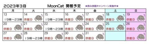 | å¶æ¥æé | å¶æ¥æé å¹³æ¥ãæãæšã20ïŒ00ãæ·±å€2ïŒ00 ããŒãã»ããªã³ã¯ã»ã«ã©ãªã± ã©ã¹ããªãŒããŒïŒ1ïŒ30 鱿«ã»éåã»ç¥åæ¥ã20ïŒ00ãæ·±å€5ïŒ00 ããŒãã»ããªã³ã¯ã»ã«ã©ãªã± ã©ã¹ããªãŒããŒïŒ4ïŒ30 å®äŒæ¥ æ¥ææ¥ â»ãã®ä»ã®èšæåºäŒæ¥ã¯ãtwitterã»HPã«ãŠãæ¡å ããŠãããŸãã ã·ã¹ãã MoonCatäžæŽ²åºã¯ã¿ã€ã ãã£ãŒãžå¶ã§ãã ïŒãäž»äººæ§ ã»æåã®60åãã900å ã»ä»¥é30忝ãã600å ïŒãå¬¢æ§ ããã£ãŒãžæç¡æ ã»ãäžäººæ§ã«ã€ãæåã«ã¯ã³ãªãŒããŒãããã ããŠãããŸãã ãæ³šæãã䌺ãããŠããã®æéå¶ãšãªããŸãã ã»ïŒïŒæ³æªæºã®æ¹ã¯ã22æä»¥éã®ãæ¥åºã¯åºæ¥ãŸããã ã»é転è ã®æ¹ã¯ã飲é ããé æ ®ããã ããŠãããŸãã | ||||||||||||||