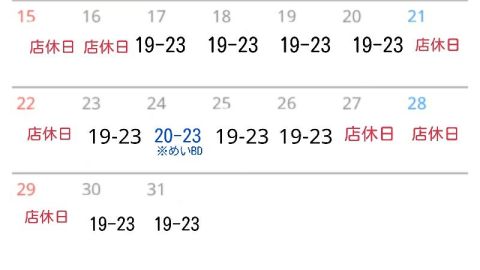 | å¶æ¥æé | å¶æ¥æé å¹³æ¥ãæãæšã20ïŒ00ãæ·±å€2ïŒ00 ããŒãã»ããªã³ã¯ã»ã«ã©ãªã± ã©ã¹ããªãŒããŒïŒ1ïŒ30 鱿«ã»éåã»ç¥åæ¥ã20ïŒ00ãæ·±å€5ïŒ00 ããŒãã»ããªã³ã¯ã»ã«ã©ãªã± ã©ã¹ããªãŒããŒïŒ4ïŒ30 å®äŒæ¥ æ¥ææ¥ â»ãã®ä»ã®èšæåºäŒæ¥ã¯ãtwitterã»HPã«ãŠãæ¡å ããŠãããŸãã ã·ã¹ãã MoonCatäžæŽ²åºã¯ã¿ã€ã ãã£ãŒãžå¶ã§ãã ïŒãäž»äººæ§ ã»æåã®60åãã900å ã»ä»¥é30忝ãã600å ïŒãå¬¢æ§ ããã£ãŒãžæç¡æ ã»ãäžäººæ§ã«ã€ãæåã«ã¯ã³ãªãŒããŒãããã ããŠãããŸãã ãæ³šæãã䌺ãããŠããã®æéå¶ãšãªããŸãã ã»ïŒïŒæ³æªæºã®æ¹ã¯ã22æä»¥éã®ãæ¥åºã¯åºæ¥ãŸããã ã»é転è ã®æ¹ã¯ã飲é ããé æ ®ããã ããŠãããŸãã | ||||||||||||||