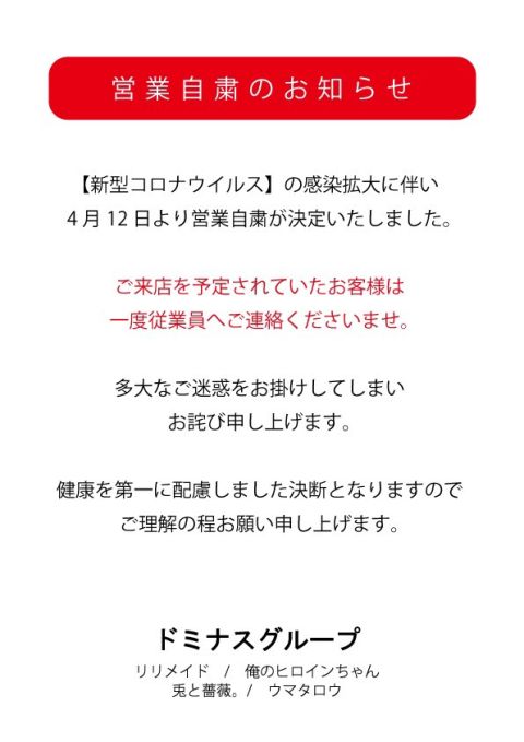 コロナ自粛要請の為、全店舗5月6日まで自粛営業になりました。