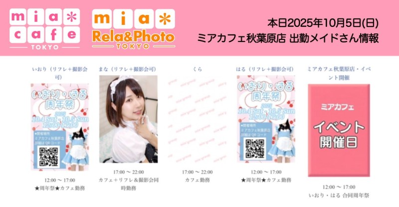 ★#メイドカフェ ・ミアカフェ #秋葉原 店★ ☕️営業予定日☕️ 🎀10月3日(金) 18-22 まな 🎀10月4日(土)【🎂いおり・はる 合同周年祭🎂】  12-17 いおり、はる  17-22 くら、まな  リラ&フォトお呼び出し出勤 みれい 🎀10月5日(日)【🎂いおり・はる 合同周年祭🎂】  12-17 いおり、はる https://t.co/LKzdHh17fL