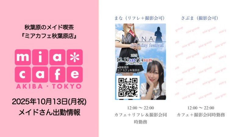 ★#メイドカフェ ・ミアカフェ #秋葉原 店★ ☕️営業予定日☕️ 🎀10月3日(金) 18-22 まな 🎀10月4日(土)【🎂いおり・はる 合同周年祭🎂】  12-17 いおり、はる  17-22 くら、まな  リラ&フォトお呼び出し出勤 みれい 🎀10月5日(日)【🎂いおり・はる 合同周年祭🎂】  12-17 いおり、はる https://t.co/LKzdHh17fL