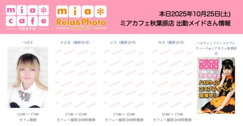 ★メイドカフェ・ミアカフェ秋葉原店★ ☕️営業予定日☕️ 🎀10月18日(土)  12-17 つばさ、もも  17-22 さぶま、まな  リラ&フォトお呼び出し出勤 みれい 🎀10月19日(日)【ぴぃ生誕祭17:00~】  12-17 つばさ、にろ  17-22 くら、ぴぃ  リラ&フォトお呼び出し出勤 みれい 🎃#ハロウィン👻 https://t.co/7cNxBdMjWF