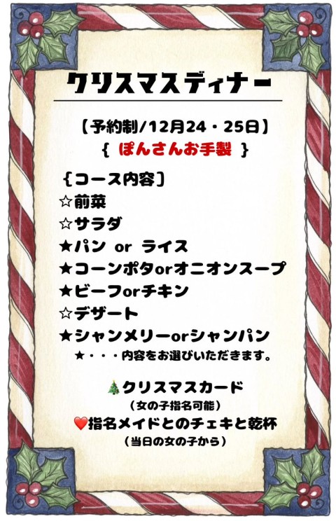 【クリスマスディナー予約開始のお知らせ】 聖なる日をメイドさんと一緒に…✨️ ꒰ ぽん ꒱お手製のクリスマスディナーです! ディナーコースご希望のご主人様、お嬢様は、日付、お時間・コース内容、指名メイドをお選びいただき、ご予約はDMおよび店頭で承ります。 予約期間:16日20時〜22日23時迄 https://t.co/iIf7vHXEDo