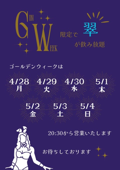 【✨GW初日OPEN🎉✨】 本日4月28日から5月4日までノンストップで営業いたします👯‍♀️ そんなバニーのGWは「GinWeek」ということで ジンの「翠」もこの期間だけ飲み放題🥂 この機会試してみては?😉 TikTokに動画も投稿しましたが秒で削除されました😉 皆様、お待ちしております🐇 #中野 #バニーガール https://t.co/P23CPYEfiP