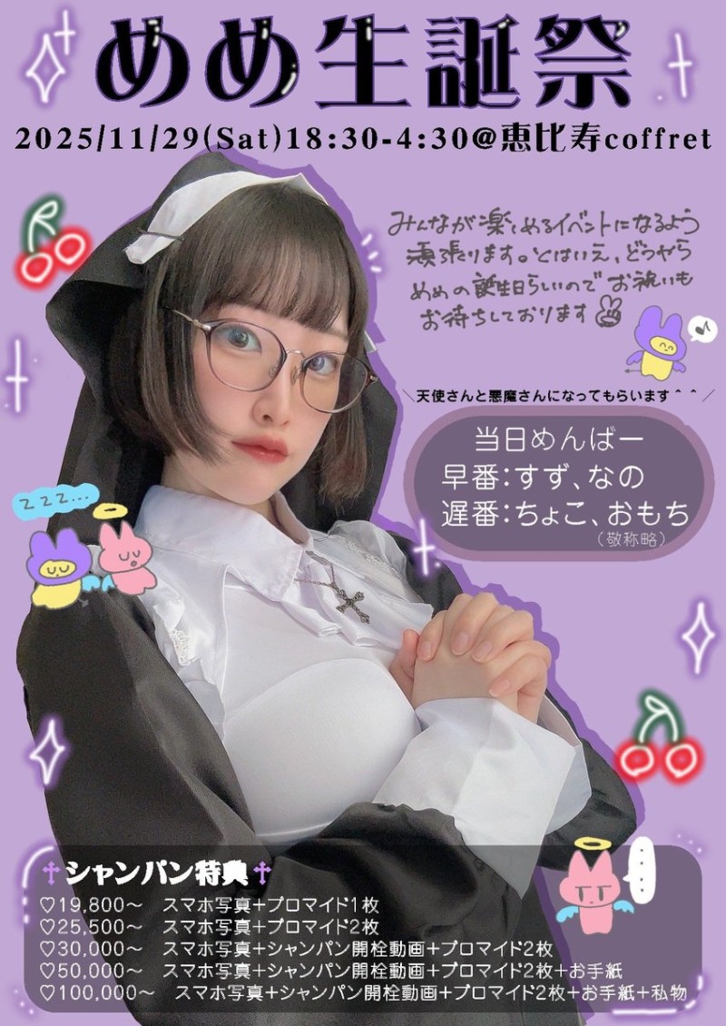 11/29(土) 18:30~4:30(Lo4:00)🧡 めめ生誕🎂✨ めめ/なの/すず/ちょこ/おもち イベント限定オリシャンおすすめです✨ #メイドカフェ #メイド喫茶 #コンセプトカフェ #コンカフェ #バイト #募集 #応募 #東京 https://t.co/P4iobunY21