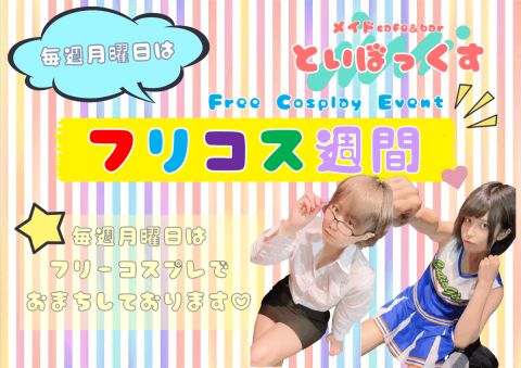 ★毎週(月)はフリコス週間★ 7月11日から毎週、月曜日はキャストがフリーコスプレでお待ちしております!! キャストそれぞれが毎週自由にコスプレできる日! 皆さんのご要望も実現するかも!? 月曜はぜひトイボックスへ(*´ω`) https://t.co/O7elyHRzQL