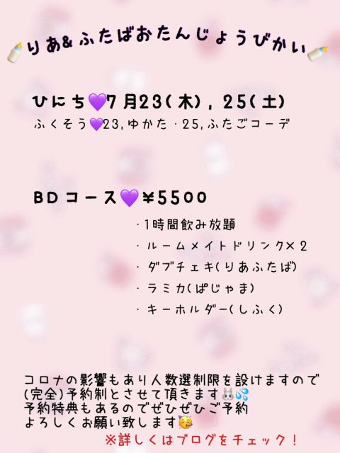 本日はりあふたばのお誕生日会です🥺💜 当日予約特典でその場で写メがとれます!📷💜 一度に入れる人数に制限があるので予約していない方はお電話して頂けるとありがたいです☺ https://t.co/t6HIouuED8
