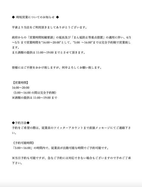 | 営業時間 | 18:00-5:00 | ||||||||||||||