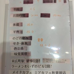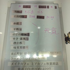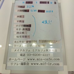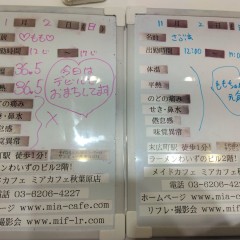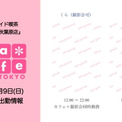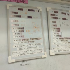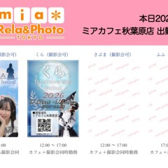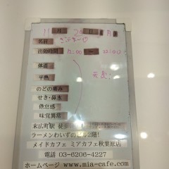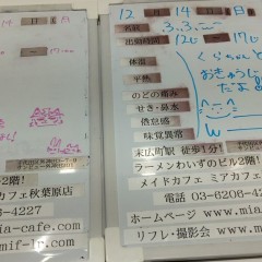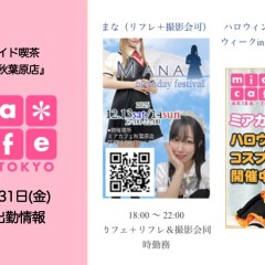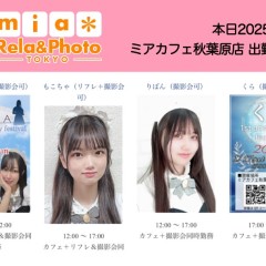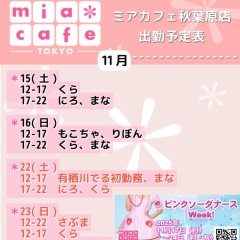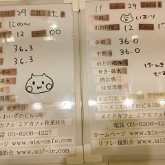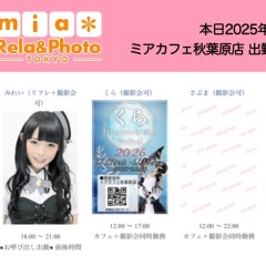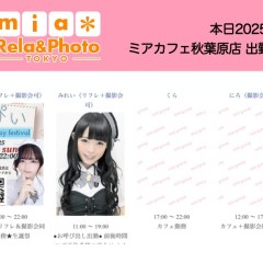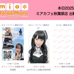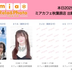 | 営業時間 | ●ミアカフェ東京店(メイドカフェ)http://www.mia-cafe.com/ ● □平日 月~金 17:00~22:00 □土曜・日曜・祝日 12:00~22:00 ★定休日 なし(2019年1月より定休日廃止) □ラストオーダー 閉店の60分前 22:00閉店の場合→21:00ラストオーダー 営業日や出勤状況についてはこちら。 http://pandaland.cutegirl.jp/mif/c_cms_csv/sch_top.php ●ミアリラ&フォト東京店(撮影会&リフレ)http://www.mif-lr.com/ ● □全日 12:00〜22:00 ですがリラクゼーション出勤スタッフがいる時間帯のみ営業です。 ★定休日は不定休(出勤スタッフがいる時間帯の営業) □最終受付 閉店の45分前 22:00閉店の場合→21:15(21:50迄に施術時間が終わるコース) ※高校生不可 ●深夜営業については、公式サイト右上の http://market.chu.jp/schedule1/sche37.cgi ミアグループ総合スケジュール(PC・スマホ) http://market.chu.jp/schedule1/sche37.cgi?dm=1 ミアグループ総合スケジュール(ガラ携帯) をご覧ください。告知日のみ営業となります。告知日以外は深夜営業いたしておりません。 深夜営業対象日 22:00〜翌朝5:00(L.O.4:00) | ||||||||||||||