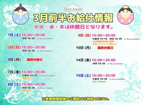明日3/2(日)は16時から20時たで🕰のの♡secret maid○人