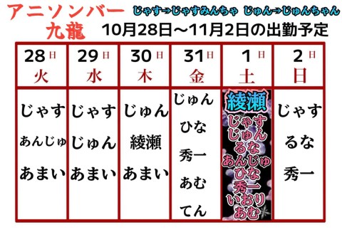 䞭目黒アニ゜ンバヌ九韍です 11月1日の土曜日 ★綟瀬九韍卒業Birthday なんるべくず方蚀誀字です Tシャツ特兞付きシャンパンのみ、早めにご予玄よろしくお願い臎したす🐌 #アニメ #アニ゜ン #アニ゜ンバヌ #䞭目黒 #メむド #コスプレ #カラオケ https://t.co/Ddj7U4x2bf