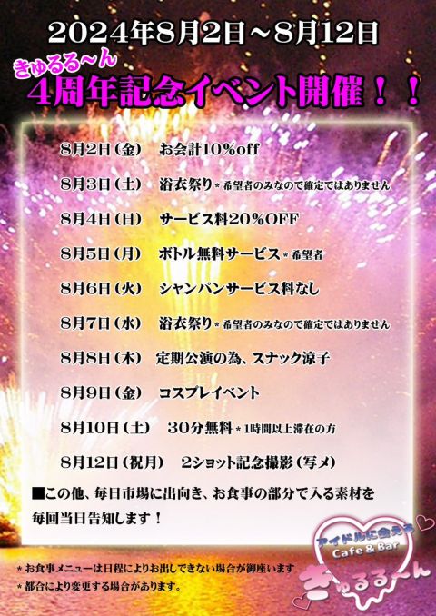 8月2日〜8月12日まで きゅるる〜ん4周年記念イベント開催! 下記画像がイベント内容ですが、都合により変更する場合もあります。 *出勤キャストが居ない日程は居酒屋営業となります🙇‍♂️ 沢山のご来店お待ちしております✨✨✨ https://t.co/Mqvswd1pDq