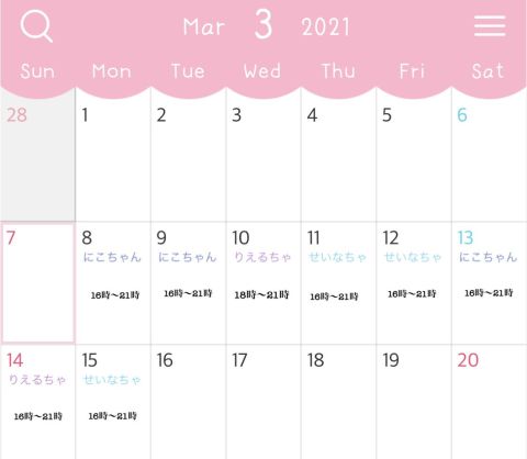 3月前半のシフト🥳 りのちゃんは今月諸事情によりお休みです 今月から営業再開して参りますのでどうぞよろしくお願いします😤✨ https://t.co/UEQ5NsGnss