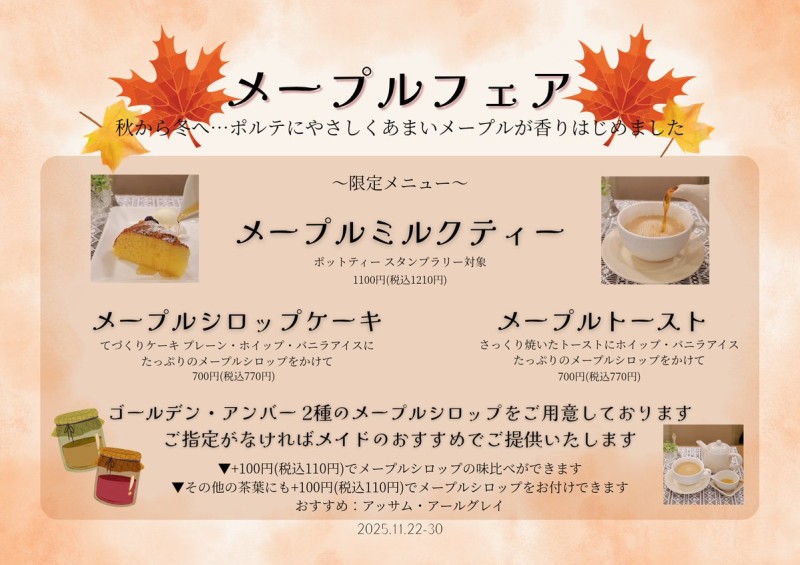 🍁11/2230 メヌプルフェア開催🍁 ⇒https://t.co/DvK35OBuyz やさしくあたいメヌプルの銙りをおたのしみください🍯✚ #カフェドポルテ https://t.co/qwPrkg35Ui