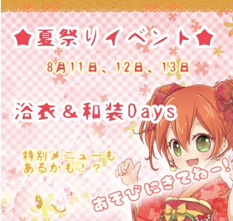 ♠️イベントのお知らせ♠️ 8月11日・12日・13日は浴衣&和装day 夏祭り気分で楽しみましょー🏮👘✨ 限定メニューもある…!?ヽ(´▽`)/ https://t.co/qQZQPcxHic