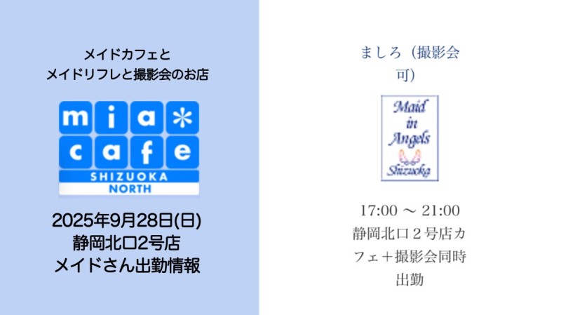 | 営業時間 | 静岡店は出勤スタッフがいれば営業です! 基本的に 12時~22時が営業時間です! ●静岡店のツイッター @shizuokamaidsan https://twitter.com/shizuokamaidsan ●ミア静岡店の営業曜日&営業時間● ☆月〜木 14:00〜22:00(最終受付20:00) ☆金曜日 12:00〜22:00(最終受付21:00) ☆土・日・祝 12:00〜22:00(最終受付21:00) 営業時間外はオンライン予約にてお願いいたします。 PC・携帯共通 → http://m-kanzume.moo.jp/yoyaku2/user.cgi ●ミアガイド出勤状況● スマホ・PC → 後日公開予定 ★静岡店スタッフによるミア甲府店でのメイドカフェリアル営業★ ☆不定期 サイトにてご確認ください。 http://market.chu.jp/schedule1/sche37.cgi | ||||||||||||||