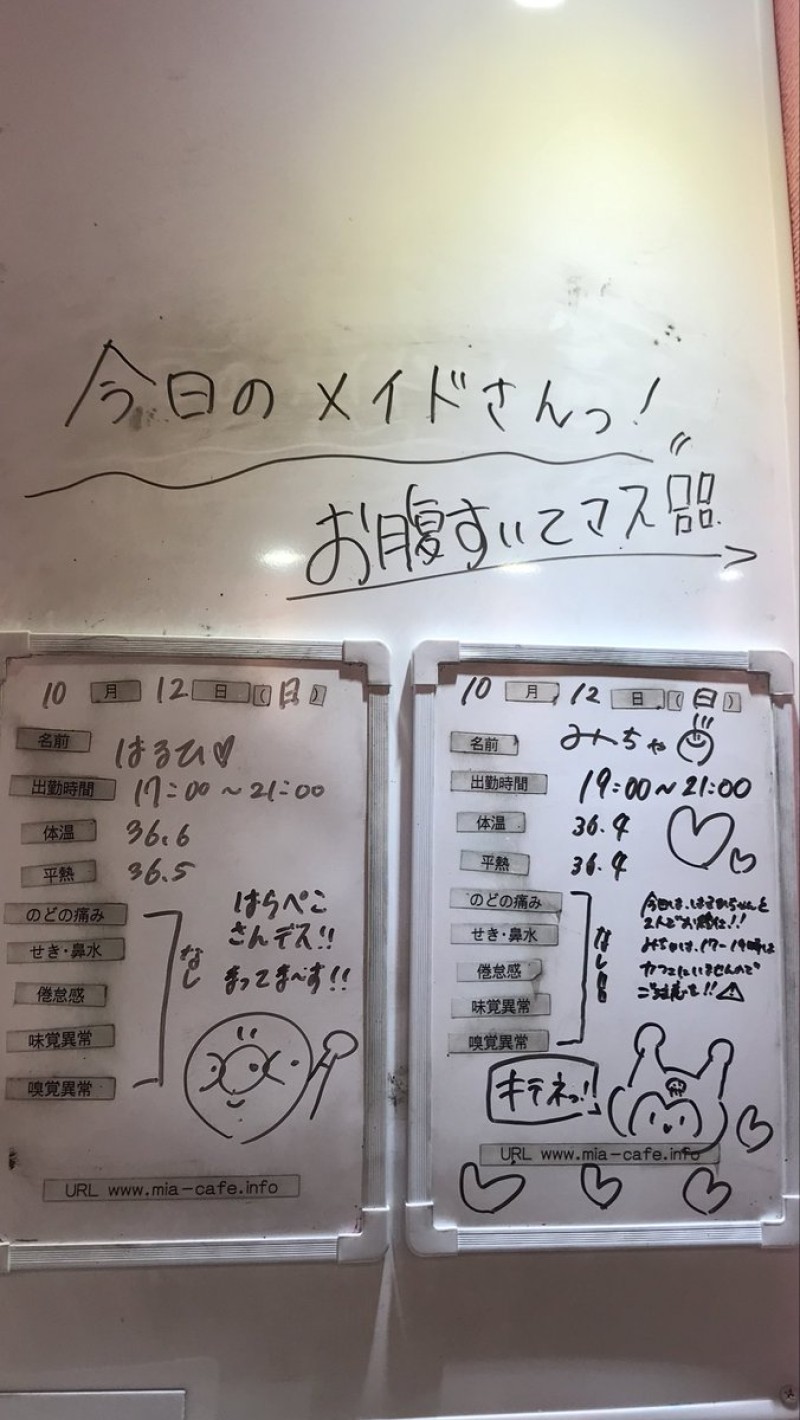 | 営業時間 | 静岡店は出勤スタッフがいれば営業です! 基本的に 12時~22時が営業時間です! ●静岡店のツイッター @shizuokamaidsan https://twitter.com/shizuokamaidsan ●ミア静岡店の営業曜日&営業時間● ☆月〜木 14:00〜22:00(最終受付20:00) ☆金曜日 12:00〜22:00(最終受付21:00) ☆土・日・祝 12:00〜22:00(最終受付21:00) 営業時間外はオンライン予約にてお願いいたします。 PC・携帯共通 → http://m-kanzume.moo.jp/yoyaku2/user.cgi ●ミアガイド出勤状況● スマホ・PC → 後日公開予定 ★静岡店スタッフによるミア甲府店でのメイドカフェリアル営業★ ☆不定期 サイトにてご確認ください。 http://market.chu.jp/schedule1/sche37.cgi | ||||||||||||||