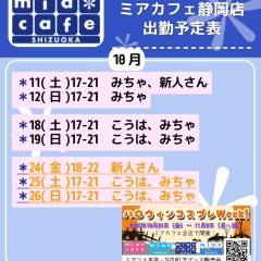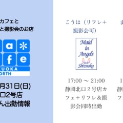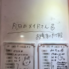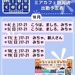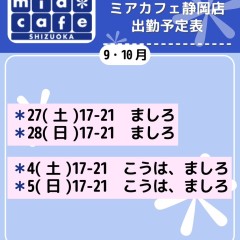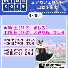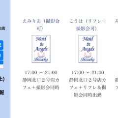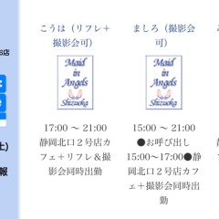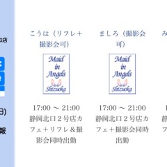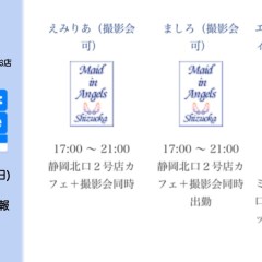 | 営業時間 | 静岡店は出勤スタッフがいれば営業です! 基本的に 12時~22時が営業時間です! ●静岡店のツイッター @shizuokamaidsan https://twitter.com/shizuokamaidsan ●ミア静岡店の営業曜日&営業時間● ☆月〜木 14:00〜22:00(最終受付20:00) ☆金曜日 12:00〜22:00(最終受付21:00) ☆土・日・祝 12:00〜22:00(最終受付21:00) 営業時間外はオンライン予約にてお願いいたします。 PC・携帯共通 → http://m-kanzume.moo.jp/yoyaku2/user.cgi ●ミアガイド出勤状況● スマホ・PC → 後日公開予定 ★静岡店スタッフによるミア甲府店でのメイドカフェリアル営業★ ☆不定期 サイトにてご確認ください。 http://market.chu.jp/schedule1/sche37.cgi | ||||||||||||||