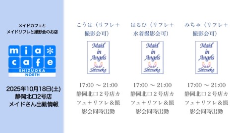 | 営業時間 | 静岡店は出勤スタッフがいれば営業です! 基本的に 12時~22時が営業時間です! ●静岡店のツイッター @shizuokamaidsan https://twitter.com/shizuokamaidsan ●ミア静岡店の営業曜日&営業時間● ☆月〜木 14:00〜22:00(最終受付20:00) ☆金曜日 12:00〜22:00(最終受付21:00) ☆土・日・祝 12:00〜22:00(最終受付21:00) 営業時間外はオンライン予約にてお願いいたします。 PC・携帯共通 → http://m-kanzume.moo.jp/yoyaku2/user.cgi ●ミアガイド出勤状況● スマホ・PC → 後日公開予定 ★静岡店スタッフによるミア甲府店でのメイドカフェリアル営業★ ☆不定期 サイトにてご確認ください。 http://market.chu.jp/schedule1/sche37.cgi | ||||||||||||||