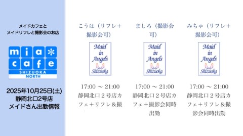 | 営業時間 | 静岡店は出勤スタッフがいれば営業です! 基本的に 12時~22時が営業時間です! ●静岡店のツイッター @shizuokamaidsan https://twitter.com/shizuokamaidsan ●ミア静岡店の営業曜日&営業時間● ☆月〜木 14:00〜22:00(最終受付20:00) ☆金曜日 12:00〜22:00(最終受付21:00) ☆土・日・祝 12:00〜22:00(最終受付21:00) 営業時間外はオンライン予約にてお願いいたします。 PC・携帯共通 → http://m-kanzume.moo.jp/yoyaku2/user.cgi ●ミアガイド出勤状況● スマホ・PC → 後日公開予定 ★静岡店スタッフによるミア甲府店でのメイドカフェリアル営業★ ☆不定期 サイトにてご確認ください。 http://market.chu.jp/schedule1/sche37.cgi | ||||||||||||||