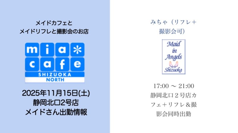 ★#メイドカフェ ・ #ミアカフェ #静岡 北口2号店★ ☕️営業予定日☕️ 💖11月15日(土) 17-21 みちゃ 💖11月16日(日) 17-21 あおね・えみりあ・こうは 🚨ポリスイベント🚨 🚨11月22日(土) 17-21 ましろ・みちゃ 🚨11月23日(日) 17-21 あおね・みちゃ 💖11月29日(土) 17-21 みちゃ #コンカフェ https://t.co/8YrP0R97Yy