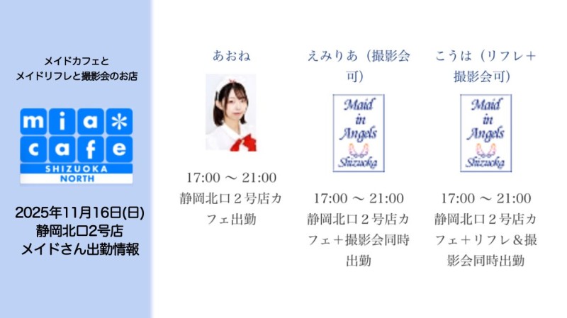 ★#メイドカフェ ・ #ミアカフェ #静岡 北口2号店★ ☕️営業予定日☕️ 💖11月15日(土) 17-21 みちゃ 💖11月16日(日) 17-21 あおね・えみりあ・こうは 🚨ポリスイベント🚨 🚨11月22日(土) 17-21 ましろ・みちゃ 🚨11月23日(日) 17-21 あおね・みちゃ 💖11月29日(土) 17-21 みちゃ #コンカフェ https://t.co/8YrP0R97Yy