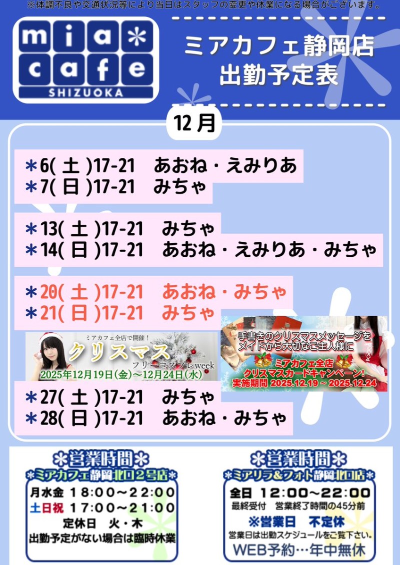| 営業時間 | 静岡店は出勤スタッフがいれば営業です! 基本的に 12時~22時が営業時間です! ●静岡店のツイッター @shizuokamaidsan https://twitter.com/shizuokamaidsan ●ミア静岡店の営業曜日&営業時間● ☆月〜木 14:00〜22:00(最終受付20:00) ☆金曜日 12:00〜22:00(最終受付21:00) ☆土・日・祝 12:00〜22:00(最終受付21:00) 営業時間外はオンライン予約にてお願いいたします。 PC・携帯共通 → http://m-kanzume.moo.jp/yoyaku2/user.cgi ●ミアガイド出勤状況● スマホ・PC → 後日公開予定 ★静岡店スタッフによるミア甲府店でのメイドカフェリアル営業★ ☆不定期 サイトにてご確認ください。 http://market.chu.jp/schedule1/sche37.cgi | ||||||||||||||